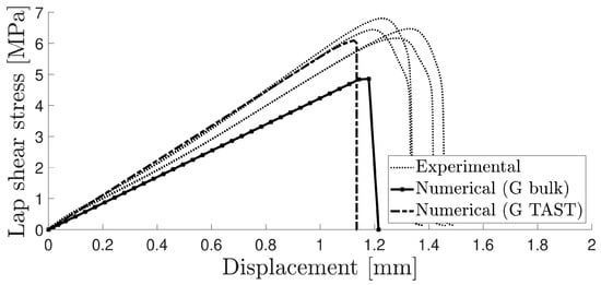 The analysed aluminium SLJs exhibited consistent testing results, with cohesive failure. Figure 15 shows the experimental data with two numerical curves: one using the thick adherend shear test and the other using the value obtained from the estimation of the Poisson’s ratio from the tensile test, performed with the DIC software (2019).