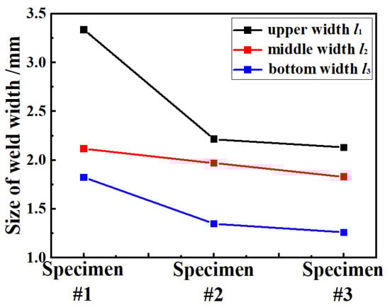 The surface forming and cross-sectional morphology of the 2219 joint with different welding speeds are shown in Figure 2. With the increase in welding speed, the cross-sectional morphology of 2219 joint changed significantly. The weld widths of 2219 joints were measured by optical microscope. Three measurement values were required in each position of 2219 joint and the average results are shown in Figure 3. With the increased welding speed, the weld width of 2219 joints decreased. It is clear that several defects are formed in weld zone (WZ). However, WZ in specimen #1 produces a larger pore with a size of about 0.75 mm, which is presumed to be a possible cold shut. Cold shut is a special form of pore, causing by the obstruction of metal vapor overflow. In addition, the lower heat input in specimen #3 decreases the cooling rate of the 2219 joint, resulting in the formation of pores [24]. It also induces the partial incomplete penetration, as shown in Figure 2(b3). Based on the above analysis, the welding process of specimen #2 is thought to be the optimized welding process parameter. However, obvious surface collapse exists in the 2219 joint of specimen #2. Węglowski et al. reported that MW with defocus electron beam could improve the surface forming [22]. The secondary MW were conducted and specimen #4 was obtained.