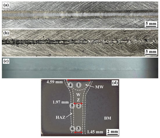 At present, most published papers about aluminum alloys welding are focused on friction stir welding [5,6,7], which could eliminate the fusion problems because of the solid state during joining. However, as for the complex joint geometry, friction stir welding may be difficult to apply. Fusion welding can also meet the welding requirements [8,9]. Among them, high-energy beam welding, such as laser beam welding (LBW) and electron beam welding (EBW), is recognized to obtain better joint performance and has a broad application space and potential [10,11,12]. Owing to the high-energy density [13,14] and vacuum protection, EBW could obtain high-aspect-ratio joint and suppress the formation of pores [15]. Therefore, EBW is particularly suitable for the welding of aluminum alloys.