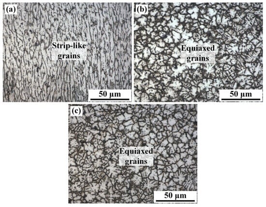 Figure 5 shows the microstructure of WZ at different positions in specimen #4, which corresponds to region 1–3 in Figure 4. With the increased distance to the upper region of the 2219 joint, the grain morphology changed from strip shape to equiaxed shape, and the grain size also increased, which was due to the non-uniformity of heat input along the thickness direction. The electron beam first acted on the surface of the BM, causing the strongest thermal action of electron beam in the upper part of the WZ. Compared with the upper metal of the WZ, the middle and lower region of WZ absorbed less heat. The action of the electron beam on the middle and lower part was weakened. In addition, the contact between the bottom part and the fixture promoted the heat dissipation, which further accelerated the cooling rate. According to the solidification theory [25], the grain size and morphology were dependent on the thermal gradient (G) and the growth rate (R) in the solidification. The value of G × R, which is the same as the cooling rate, determined the grain size of the WM. According to Equation (1), the greater the distance (h) to the upper region of the WZ, the higher the thermal gradient. Therefore, the thermal gradient and the G × R value increased with welding depth during the welding of thick plates. Eventually, a large number of fine and equiaxed grains nucleated in the middle and bottom region of the WZ, which is similar to the results from published literature [11].