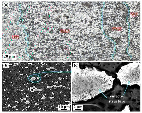 Figure 10 shows the microstructural feature of the HAZ. The white precipitates with a size of 6–11 μm presented inhomogeneous distribution, which is recognized as Al-Cu eutectic. Since the HAZ is close to the WZ, the peak temperature was higher (>550 °C). The Al2Cu phase underwent dissolution. The low melting point eutectic phase was infiltrated along the GBs. During the subsequent cooling process, the Al-Cu eutectic was precipitated to form block shape. Hence, the coarse block eutectic microstructure appeared in the HAZ.