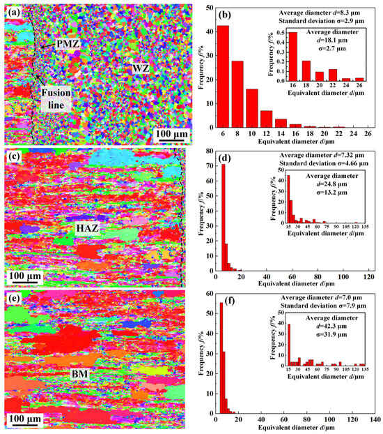 Grain morphology and statistical dimensions of the (a,b) WZ, (c,d) HAZ, (e,f) BM (specimen #4).