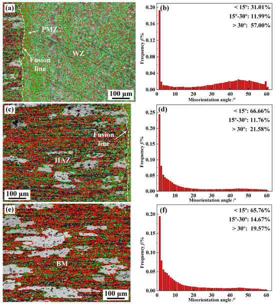 The GB characteristics and grain misorientation angle of (a,b) WZ, (c,d) HAZ, (e,f) BM (specimen #4).