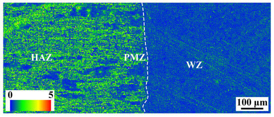 Local orientation distributions in the PMZ, OAZ, and HAZ of the joint are shown in Figure 13. The difference of local orientation can reflect the deformation degree of the grains and the distribution of dislocation density. Compared with the WZ, the deformation in the regions of BM, HAZ, and PMZ was obvious. Among these four regions, the dislocation density of the HAZ was the highest and that of the WZ was the lowest. Before welding, the BM (2219 aluminum alloy) was subjected to 10% cold deformation and the subsequent O-state annealing heat treatment could not completely eliminate the deformation. The WZ consisted of fine grains subjected to the solidification process, resulting in the lower residual deformation. However, the peak temperature of the HAZ was very low, which basically had no effect on the residual deformation from the BM in the process of welding. As a result, the dislocation density in the HAZ was higher than that in the PMZ and WZ.