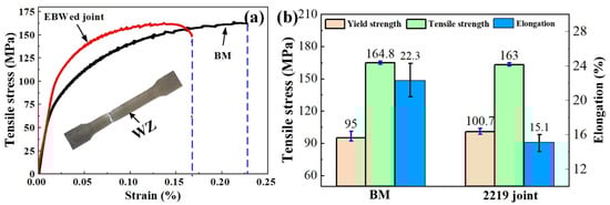 (a) Tensile stress–strain curve and (b) tensile properties of 2219 joint (specimen #4) and BM.