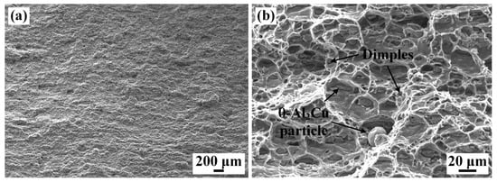 SEM images of the fractured surface of the 2219 joint (specimen #4): (a) low-magnification morphology; (b) enlarged dimples and second-phase particles.