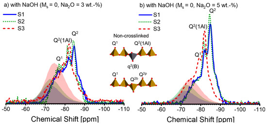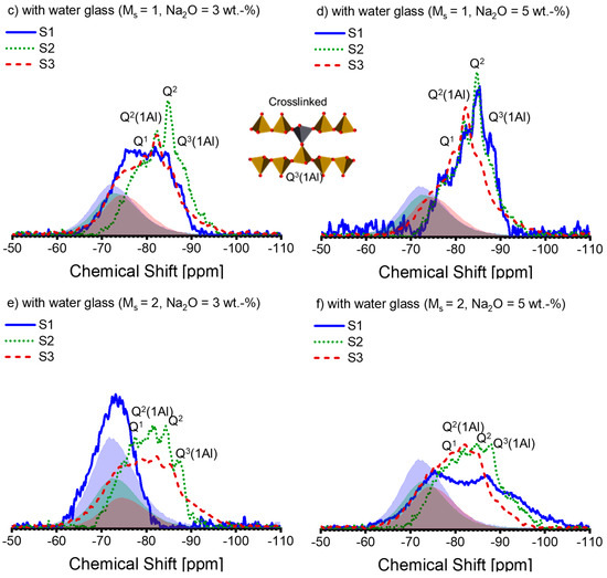 - Le Saoût, G.; Ben Haha, M.; Winnefeld, F.; Lothenbach, B.; Jantzen, C. Hydration Degree of Alkali-Activated Slags: A 29Si NMR Study. J. Am. Ceram. Soc. 2011, 94, 4541–4547. [Google Scholar] [CrossRef]