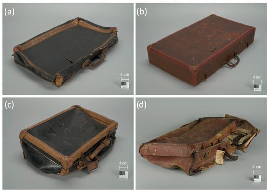 Suitcases covered with artificial leather, stored in the A-BSM Collections: (a) A suitcase covered with artificial leather based on cellulose nitrate, in black color, with the addition of dibutyl phthalate as a plasticizer, on a cotton substrate; (b) A suitcase covered with artificial leather based on cellulose nitrate, in brown color, with the addition of dibutyl phthalate, on a cotton substrate; (c) A suitcase covered with artificial leather based on cellulose nitrate, in black color, with the addition of dibutyl phthalate and rosin, on a paper substrate with a predominance of wood pulp; (d) A suitcase covered with artificial leather based on cellulose nitrate, in brown color, with the addition of dibutyl phthalate, on a cotton substrate. Photos by S. Mrozek.