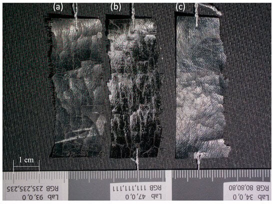 Samples of artificial leather with cellulose nitrate coating: (a) CN sample; (b) CN + PVA sample; (c) CN − PVA sample. Photo by M. Maciaszczyk.
