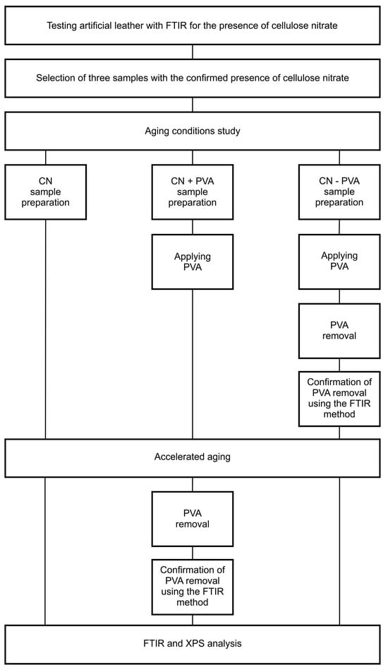 The CN and CN + PVA samples were prepared to determine the effect of the protective PVA coating on the degradation of cellulose nitrate in the artificial leather, whereas the CN PVA sample was prepared to investigate whether the removal of the secondary coating using water has a detrimental effect on cellulose nitrate.