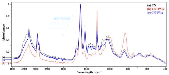 FTIR-ATR spectra for three samples subjected to artificial aging processes: (a) CN, (b) CN + PVA, and (c) CN − PVA.