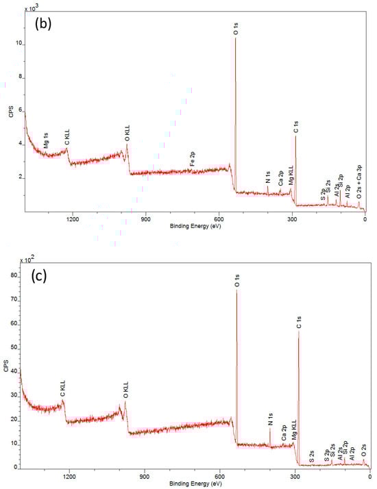 To evaluate changes in the elemental composition, types of functional groups, and chemical bonds on the surface of the tested samples, high-energy X-ray radiation was employed. The samples were analyzed under high-vacuum conditions in a multi-chamber UHV (ultra-high vacuum) system from Prevac, Poland. After mounting the samples on a molybdenum holder, they were degassed under steady high vacuum at room temperature in the load-lock chamber of the UHV system. Subsequently, the actual XPS analysis was conducted following the transfer of the holder with the sample to the analytical chamber of the UHV system. Monochromatic radiation with Al Kα characteristic line at 1486.7 eV energy was used as the excitation source, originating from an aluminum anode.