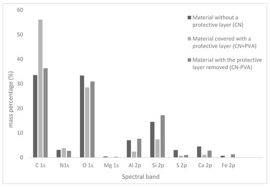 A complementary technique used in studies concerning the applicability of a protective layer of polyvinyl alcohol is X-ray photoelectron spectroscopy (XPS). The spectra obtained from the measurements (Figure 6) allowed for the determination of the elemental composition of the outer coating layer covering the tested materials after the degradation process.