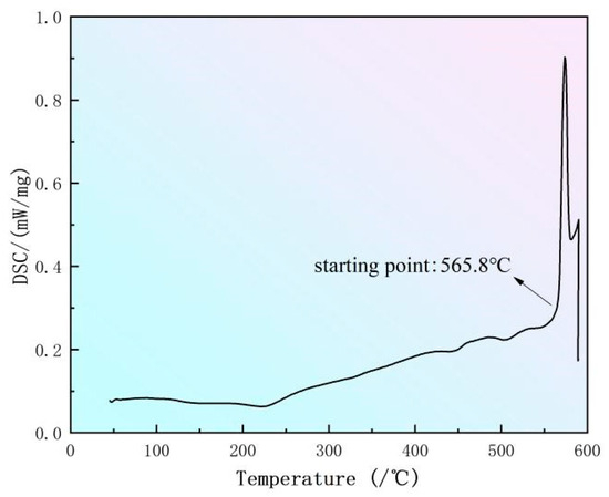 The result of the DSC analysis of the alloy is shown in Figure 2. The moment it reaches 565.8 °C, the endothermic peak begins, and the low melting point eutectic phases within the alloy begin to melt. It can be inferred that this alloy can be strengthened at a temperature below 565.8 °C. Otherwise, the material may overheat and lose efficacy. To prevent experimental errors caused by powder samples in DSC experiments, the solid solution temperature of 585 °C can be added for further investigation.