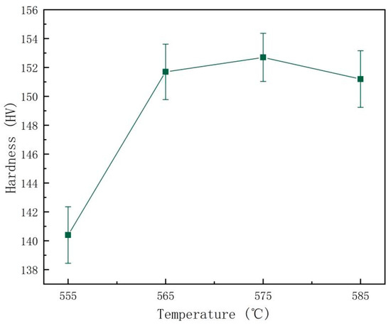 Figure 5 depicts the curves of hardness after solid solution treatment at various temperatures. In the temperature range, the specimen’s hardness displays an increasing and then decreasing trend. The specimen’s hardness significantly increases at 565 °C and 575 °C, and continuing to raise the temperature may lead to a decrease in the hardness of the alloy due to overburning.
