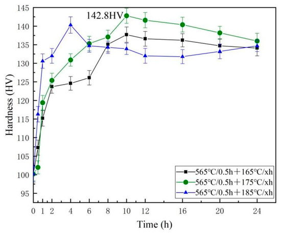 The hardness graphs after aging at various temperatures are shown in Figure 6. In the early stage of aging, the hardness value of the alloy rapidly increases due to the formation of Mg and Si clusters, which subsequently evolve into GP zones that are coherent with the Al matrix. At this point, the strengthening effect of the alloy will depend on the GP region, and the strength of the alloy will be improved through the shear mechanism of dislocations. As the aging time increases, the GP region transforms into β″ phases, which are the most important strengthening phase; when β″ phases completely precipitate, the maximum strengthening effect is achieved, and the hardness of the alloy is the highest at this time. As the aging time continues to increase, the hardness decreases, which is because β″ precipitates are coarsening. In addition, the results show that, at the same temperature, the hardness of the sample goes up at first, then down as time goes on. With the rise of aging temperature, it will take a shorter time to attain the peak hardness. At 185 °C, which is especially obvious compared with 175 °C, the time required to obtain the aging peak hardness has been reduced from 10 h to 4 h. The hardness raised to 142.8 HV after aging at 175 °C for 10 h, which was higher than any other temperatures. The results of the hardness curves indicate that the best aging condition for Al-Mg-Si alloys in this study is aging at 175 °C for 10 h.
