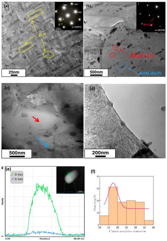 The energy held by the matrix is increased when Er and Zr are added to the matrix solid solution. Furthermore, the precipitation phase impedes grain boundary migration, which refines the grain and improves the alloy’s properties [22]. After the solid solution, some intermetallic compounds dissolve in the matrix and create a supersaturated solid solution. During the aging process, large quantities of diffuse phases were produced. As seen in Figure 8d, TEM analysis indicated the appearance of Al3(Er, Zr) phases in the alloy, which are dispersed in the aluminum matrix, playing a role in dispersion strengthening. Al3(Er, Zr) phases have a small lattice constant and a core-shell structure, which prevents particle coarsening and enhances the mechanical strength and plasticity of the aluminum alloy.
