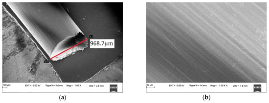 The SEM analysis of optical fibers was carried out to determine the cut surface properties and the surface properties. The surface impacts the bonding efficiency, with rough surfaces conducive to better bonds, whereas smoother surfaces reduce the bond strength. More irregular surfaces impart better friction and pull-out resistance as they increase the surface area available for bonding and help with interlocking. The cut surface properties are essential to the study as they can affect the transmittance properties, and the technique used to cut fibers can result in high losses in transmittance if the surface is uneven. There can also be reflective and refractive losses due to rougher surfaces. Figure 1a is a typical cut surface, and Figure 1b is the typical longitudinal surface of a fiber. The cut surface indicates that the fiber has no crushing, with a diameter of 0.982 mm for the 1 mm of fiber. Other such samples also had variations between 0.978 mm and 0.994 mm, within acceptable manufacturing limits of error. The visual inspection of the surface also shows a mostly flat and clean cut, with pinching at one edge. This indicates a low loss in transmittance, as evident from the results of transmittance tests. The longitudinal surface in Figure 1b shows that the fibers have a relatively smooth surface, which could lead to pulling out and losses in strength. Still, the loss is very low in most cases due to the relatively small diameter of the fibers compared to the total area of concrete in which it is embedded.