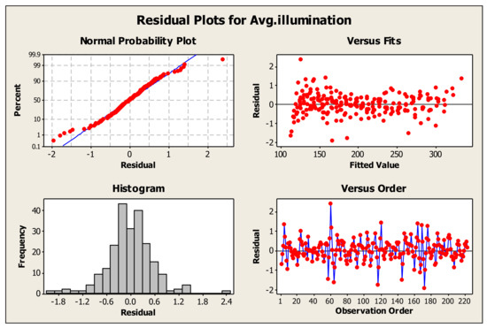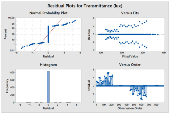 There is a strong dependency on the irradiance of the sun in the transmittance of light as their behavior is similar based on the time of the day. This is indicative of an interdependency that was further verified with MANOVA. Table 5 and Figure 11 detail the results of the general linear model and MANOVA analysis. It is clear from the results that there is a definite significance between illumination and irradiance. The same characteristics are seen for interaction effects where the effects analyzed with irradiation have a definite correlation. The spacing of fibers is insignificant for transmitting natural light, and similarly, the interaction between irradiation and spacing is also insignificant. Figure 11 represents the residual plots of MANOVA analysis for average annual illumination as compared to the irradiance characteristics. The plots indicate that the statistical model suitably validates the results obtained with MANOVA.