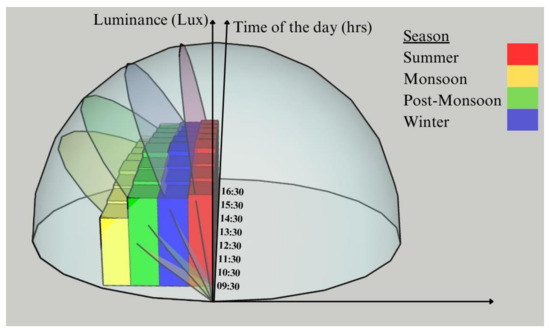 Figure 8 illustrates the average seasonal path of the sun throughout the year and the seasonal luminance for mix M73. These angles were obtained from the metrological department of India and then averaged to obtain the seasonal averages. The figure indicates how the sun’s path changes due to seasonal variations and how that significantly affects luminance. This is inherently due to the properties of optical fibers, which have an allowable acceptance cone, and, when the angle of incidence reduces, the photons available for transmittance also reduce.