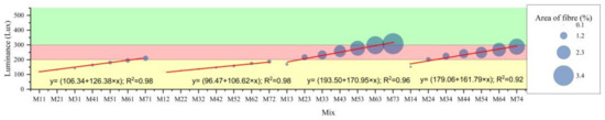 Plot of mix vs. annual average luminance and area of fibers with regression analysis.