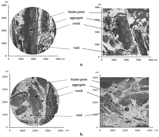 From micro level, the mechanical strength characteristics of vegetation porous concrete are influenced by the interactions among its various components within the microstructure. The hardening process of cement involves hydration reactions and crystal formation, leading to an increase in the strength of the cementitious material [81]. Additionally, other added materials may either promote or interfere with the hydration of cement. Méryl Lagouin [82] used corn and sunflower residues as biobased materials, and lime with kaolin as binders to prepare bio-based aggregate-based concrete. To better understand the stress–strain behavior of the material, X-ray tomography scans were conducted on the kaolin-based concrete, as shown in Figure 7. The test results indicate the presence of shrinkage cracks at the interface between the bio-based aggregate and the binder paste. This implies that even in the absence of external loading, the concrete exposed to a dry environment experiences shrinkage, leading to increased tensile stress and subsequent cracking. In the absence of external loading, concrete exposed to dry environments undergoes shrinkage, leading to increased tensile stresses and crack formation. Shen [46] used scanning electron microscopy (SEM) to observe steel slag vegetation porous concrete specimens with phosphogypsum as a variable. In SEM images of the carbonated consolidated matrix containing 2.5% phosphogypsum, symmetric hydration products (calcium aluminate, hydrated gel) were observed. Carbonation resulted in the generation of a significant amount of calcium carbonate, with more interconnected and denser crystals, indicating a positive effect of reasonable phosphogypsum incorporation on the carbonation of steel slag.