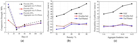 Wang [43] conducted a comprehensive study on the impact of plants on vegetation porous concrete. It was observed that during the initial 28 days after planting, the compressive strength of vegetation porous concrete significantly decreased due to plant growth, followed by a gradual recovery. Increasing the porosity to a certain extent reduced the weakening effect of plants on strength, as shown in Figure 8a. After planting, the permeability of vegetation porous concrete was similar to that after soil cover, with a significant decrease in the permeability coefficient, although it remained higher than that of regular soil, as shown in Figure 8b. Several days after planting, the compressive strength of vegetation porous concrete did not show a significant decline compared to before freeze–thaw cycling, indicating that planting vegetation can enhance the frost resistance of vegetation porous concrete, as shown in Figure 8c.