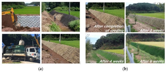 Slope application of vegetation porous concrete: (a) repair process [83]; (b) construction application effect [83].