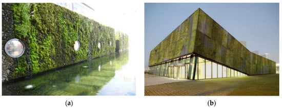The Polytechnic University of Catalonia [9] has pioneered a low-pH gravel substrate for the cultivation of blue–green algae, green algae, and mosses. They have designed specialized multilayer systems capable of collecting rainwater and storing it within the material’s microscopic structure to prevent moisture loss. This material can serve as decorative elements in architecture, as illustrated in Figure 10b. The dream of lush green gardens has long been part of human aspiration, and vegetation porous concrete presents a practical solution for incorporating living nature into urban architecture.