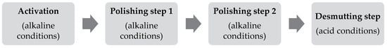 After checking the initial roughness of the samples described previously, the samples were post-processed following the chemical polishing method described in WO 2021/094641 [19]. Activation of the surface is performed under alkaline conditions using sodium hydroxide; then, two polishing steps are performed also by means of an alkaline solution combining sodium hydroxide (1.5%) and potassium carbonate (25%), and finally, the desmutting step is performed using acetic acid (5%). The overall process is performed at room temperature and can be repeated by n cycles depending on the initial roughness of the metal parts and the final requirements. The schematic process is represented in Figure 2.