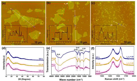 AFM images and sizes of (a) GO-L, (b) GO-M, and (c) GO-S. (d) XRD patterns and (e) FTIR and (f) Raman spectra of GO-L, GO-M, and GO-S.