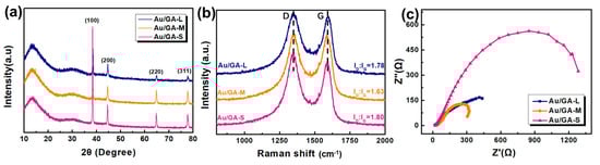(a) XRD patterns, (b) Raman spectra, and (c) Nyquist plots of Au/GA-L, Au/GA-M, and Au/GA-S.