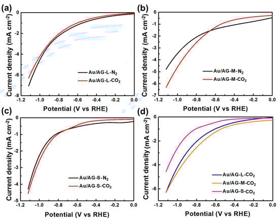 LSV curves show the response degree of a catalyst to a current at different potentials to preliminarily determine the electrocatalytic activity of a catalyst. As shown in Figure 4, three Au/GA nanocatalysts with different pore structures responded to different current densities at different potentials. The LSV curves of Au/GA-L indicate that the current density in the saturated N2 atmosphere was slightly higher than that in the saturated CO2 atmosphere, suggesting that Au/GA-L may prefer the HER rather than the CRR. The current density of Au/GA-M in the saturated N2 atmosphere before −0.69 V was higher than that in the saturated CO2 atmosphere, indicating that Au/GA-M may prefer the HER before this potential. Nevertheless, the current density in the saturated CO2 atmosphere after −0.69 V was higher than in the saturated N2 atmosphere, indicating that Au/GA-M starts to transition to the CRR after this potential. Similarly, Au/GA-S also began to prefer the CRR at around −0.69 V. Figure 4d shows that the reduction current density of Au/GA-M in the saturated CO2 atmosphere was slightly higher than that of Au/GA-L and much higher than that of Au/GA-S. The above results indicate that the electrocatalytic activity of Au/GA-M is theoretically higher than those of Au/GA-L and Au/GA-S.
