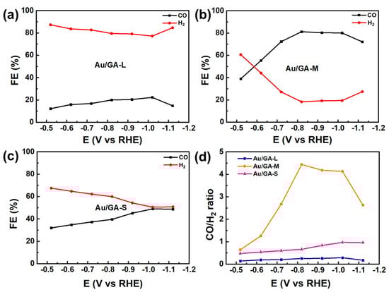 (a–c) FEs and (d) CO/H2 ratios of Au/GA-L, Au/GA-M, and Au/GA-S at different potentials.