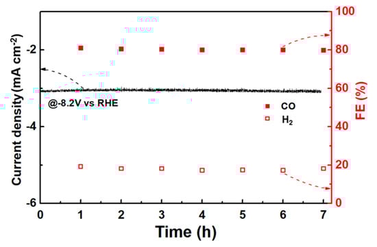 The products of the CRR of the three samples could be detected online using a gas chromatograph connected to an electrochemical workstation. Since the main CRR product of the noble metal Au is CO, the main products CO and H2 were pertinently detected, and Figure 5 presents the detection results. As expected, Au/GA-M showed the optimal ability to transform CO2 to CO. The Faradaic efficiency (FE) of CO reached a maximum value of 81% at −0.82 V vs. an RHE. This was followed by Au/GA-S, with a maximum value of 46% at −1.02 V vs. an RHE, and finally Au/GA-L, with a maximum value of only 20% at −1.02 V vs. an RHE (Figure 5a–c). Although Au/GA-L responded more to a current with the same potential and had a stronger electron conduction capacity than Au/GA-S (Figure 3c and Figure 4d), its CRR performance was much lower than those of the other samples. For Au/GA-L, it preferred the HER rather than the CRR, and thus the CRR performance of Au/GA-L was lower than that of Au/GA-S (Figure 5d). Specifically, the CO/H2 ratio of Au/GA-M reached a maximum of 4.4 at −0.82 V. The stability test of Au/AG-M revealed that the catalytic performance of Au/AG-M for CO showed no significant decline during a 7 h reaction, with an FECO consistently exceeding 80% and an FEH2 lower than 20% (Figure 6). This demonstrates that the Au/AG-M catalyst maintains both high catalytic activity and stability throughout the CRR process.