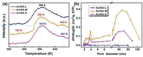(a) CO2-TPD analysis and (b) pore size distribution of Au/GA-L, Au/GA-M, and Au/GA-S.
