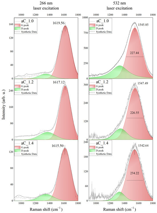 The Raman spectra registered for the a-C thin films irradiated by 266 nm (left) and 532 nm (right) lasers and fitted with D and G elementary spectra.