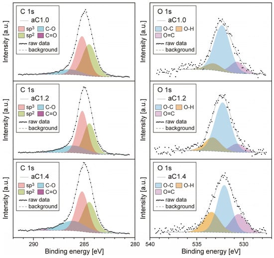 The oxygen peak originating from the O1s level has a much lower intensity than C1s in all samples, but is relatively broad. It can be deconvoluted using three components. The most intense of them, found at an energy of 532.2 eV, comes from O-C bonds [49]. The peak from the oxygen atoms involved in O=C carboxyl bonds is found at an energy of approximately 530.7 eV [49]. The third component, occurring at around 533.3 eV, most likely comes from O-H bonds [49]. The deconvoluted XPS spectra confirm that, in all samples, the share of carbon diamond bonds (sp3) is relatively high and, compared to graphite bonds (sp2), is estimated to be approximately 55%. The XPS analysis did not show, however, any significant differences between the tested samples. The main difference is the total oxygen content. In sample aC1.0, the surface atomic concentration of oxygen was estimated at 8.8%, while in aC1.2, it was 6.2%, and in aC1.4, only 4.7%.
