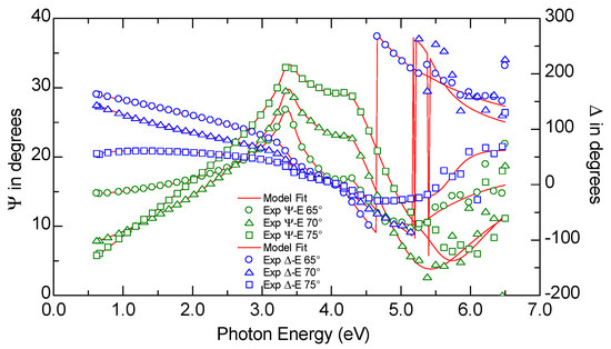 Spectroscopic ellipsometry (SE) measurements were performed using the V-VASE instrument from J.A.Woollam Co., Inc. (Lincoln, NE, USA). The Ψ and Δ ellipsometric azimuths are defined as [44,45]: