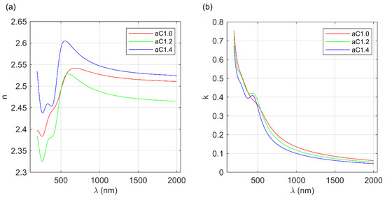 The thicknesses of the fabricated a-C films are summarized in Table 2, and are equal to 32.1 ± 0.4 nm, 22.1 ± 0.4 nm, and 21.5 ± 0.3 nm for aC1.0, aC1.2, and aC1.4 carbon layers, respectively. The optical constants of the deposited amorphous carbon layers (the real part of the complex refractive index—n and the extinction coefficient—k) are shown in Figure 5. The shape of the refractive index for all of the carbon films (Figure 5a) is similar. In the infrared (IR) spectral range, the normal dispersion can be observed, i.e., a decrease in the refractive index value with the increasing wavelength. This behavior of n is typical for dielectric materials [50]. In the visible (vis) and in the ultraviolet (UV) spectral ranges of electromagnetic radiation, the absorption bands can be observed. Values of the refractive index in IR are in the range from 2.45 to 2.55, wherein the lowest values have been obtained for the aC1.2 sample and the highest for the aC1.0 film. Generally, the refractive index of carbon layers in the IR spectral range depends on the density of the fabricated coating (which can be in the range from 1.6 to 3.5 g/cm3), and is in the range from 1.5 to 2.6 [3,30]. The obtained values of n are evidence that the deposited a-C thin films are dense.