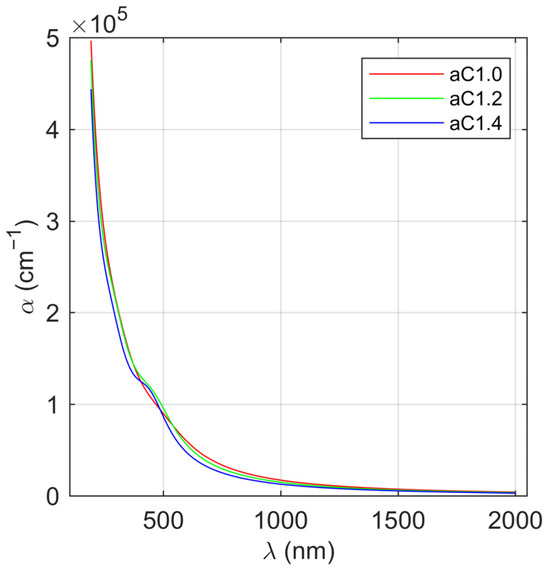 The extinction coefficient (see Figure 5b) increases with the decrease in the wavelength. In the IR spectral range, the values of k for all of the analyzed a-C thin films demonstrate low (k < 0.2), however, nonzero, values. Therefore, this spectral region can be described as weakly absorbing. In the vis and UV range, the extinction coefficient values increase to (depending on the sample) 0.65–0.75. Two absorption bands are visible for the fabricated amorphous carbon layers in the spectral range of 190–2000 nm: the first one at about 400–500 nm (for the sample aC1.0, it is screened by the second band appearing in UV) and the second below 190 nm. Only an edge of this band is visible in Figure 5b, because its maximum lies outside the measuring range. Based on the determined extinction coefficient (see Figure 5b), the absorption coefficient (α) has been calculated (see Figure 6) using the following formula [45]:
