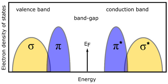 Depending on the method and synthesis conditions of the carbon layers, the obtained material is generally built of carbon atoms with sp2 and/or sp3 hybridization, and its properties (including optical) strongly depend on the bonds between the C atoms. The optical properties of the carbon layers can be explained based on the schematic shown in Figure 7; the electron density of states. For the diamond (the bonds between C atoms exhibit sp3 hybridization), only σ bonds are formed, while in the case of materials containing C atoms with both sp2 and sp3 hybridization, additional π bonds are formed.