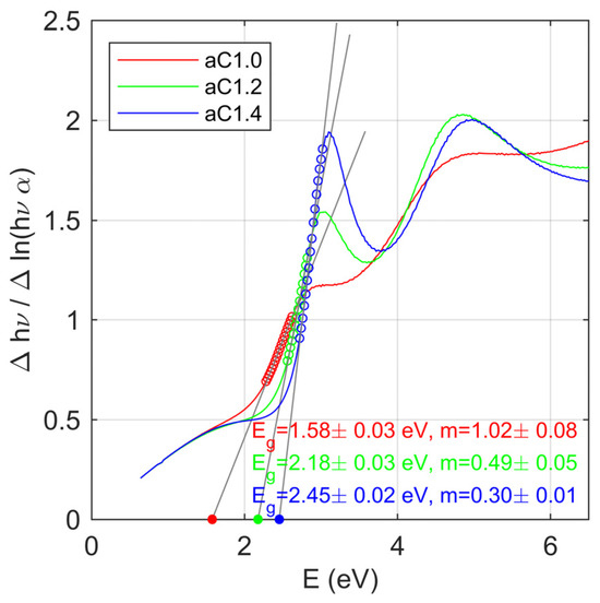 The ILD plot for the fabricated a-C films is presented in Figure 8. The determined values of the energy gap Eg and the m coefficient are summarized in Table 3. For the aC1.0 sample, the band-gap energy lies in the near-infrared spectral range (Eg = 1.58 ± 0.03 eV; 785 ± 20 nm) and the m coefficient is about 1 (m = 1.02 ± 0.02). For the other samples (aC1.2 and aC1.4), the band-gap energy is in the visible spectral range. For the aC1.2 thin film, Eg = 2.18 ± 0.03 eV (569 ± 8 nm), and for aC1.4, Eg = 2.45 ± 0.02 eV (506 ± 5 nm). The value of the m coefficient for these films is two to three times lower than that estimated for the aC1.0 carbon layer. The determined values of the m parameter indicate the direct band-gap for the aC1.2 and aC1.4 films, while the aC1.0 sample contains fractions responsible for both direct and indirect transitions.