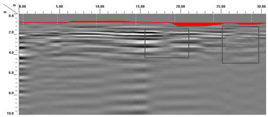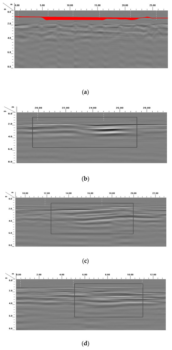 As shown in Figure 1, the radar electromagnetic wave reflection is strong, and the reflection interface is clear, which indicates that the selected road segment exhibits subsidence and a cavity under the road surface of 2~4 m. The red line separates the asphalt pavement layer from the foundation. It indicates that the asphalt pavement thickness is 1.04 m, which is bigger than that of conventional asphalt pavement thickness (0.18 m). The reason is that owing to the asphalt pavement subsidence, the asphalt pavement has been overlaid many times. The subsidence and cavity are reflected in the wavy peak valley in the ground penetrating radar picture. Furthermore, the cavity place is reflected in the partial shadow cavity in the ground penetrating radar picture. It indicates that ground penetrating radar is a good method to test the pavement subsidence.