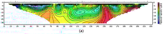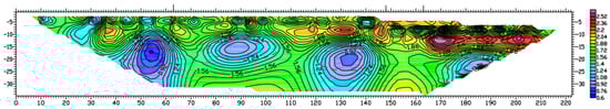 As shown in Figure 2, the results from the high-density electrometer show that the overall change in the resistivity value is complicated; the horizontal fluctuation of resistivity values is low, which is presumed to be qua-ternary strata. The red dotted line is the soft foundation under the road surface of 10~25 m, where the resistivity value is the smallest. There exists a cavity above the soft foundation. Furthermore, the resistivity value of the soft foundation is very close to the resistivity value of water, which indicates that there may exist water in the soft foundation areas. The results from the high-density electrometer also show that there is a big difference in the resistivity value when the test place is different. It indicates that there exist big differences in geology at the different test places and the high-density electrometer can also test the pavement subsidence place and distribution.