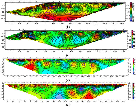 As shown in Figure 6a, the high-density electrometer picture after grouting indicates that the resistivity shows a high and low variation trend, which is a typical H-type geoelectric layer structure [23]. The original subsidence and cavity areas were filled with polyurethane composite materials (sample 5#) and the resistivity of the original subsidence areas increased. The road surface had some low resistivity areas, which showed that the polyurethane composite grouting material drains the moisture of the roadbed above the grouting hole. Moreover, polyurethane composite grouting material itself is a kind of high-resistivity material. These results are in good agreement with the results of core sampling. As shown in Figure 6b–e, there are some diseases in these grouting areas. So, we can conclude that the grouting effects of samples 1#–4# are not good. The grouting effects of sample 5# indicate that it is the best for asphalt pavement subsidence.