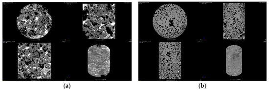 The CT of polyurethane composite materials’ (sample 5#) consolidated core samples: (a) upper layer, (b) lower layer.