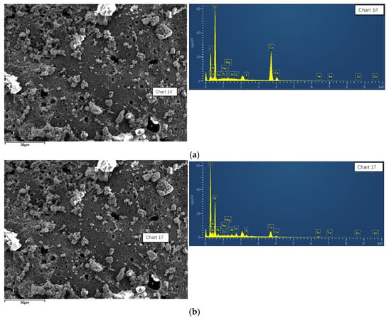 As shown in Figure 12, the 5# energy spectrum (EDS) results showed that there is much C, O, N, Ca, Mg, Si, and Al. The C, O, and N belong to the polyurethane and Ca, Mg, Si, and Al belong to red mud-based geopolymer. Semi-quantitative calculation finds that there is 35% geopolymer and 65% polyurethane in point 1. And there is 10% geopolymer and 90% polyurethane in point 2. Compared with the results of area 1 and area 2, the contents of the geopolymer and polyurethane are different, and the difference is very big. Owing to the fact that the geopolymer/polyurethane ratio is 85:15, the EDS results are not suitable, which demonstrates that the upper core sample is usually filled with polyurethane rather than red mud-based geopolymer and there is in-homogeneous distribution of polyurethane composite materials. The content of polyurethane is greater in the polyurethane composite materials’ core sample. Further, polyurethane and red mud-based geopolymer are alternated in selected areas and the geopolymer is dispersed in the pores of the polyurethane foam.