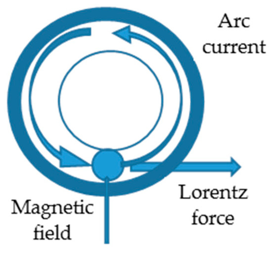 The Lorentz force, created by the interaction between the arc current (Ia) and the magnetic field (Br), is expressed by the equation