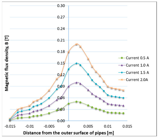 Based on the 3D non-linear finite element electromagnetic analysis (FEA), Vendan, S.A. et al. [12] have investigated the radial magnetic flux distribution, generated in the space between the tubes, by modifying the gap size and the coil position. It was found that the magnetic flux concentration is higher in the space between the tubes when the gap size is minimum, and its effect reduces along the length of the pipe, from one edge to another (Figure 3). The simulation results were experimentally validated by measuring with a Gauss Meter device the radial magnetic flux density at various positions from the pipe surface. The experimental results confirmed the strong interconnection between the magnetic field distribution, on the one hand, and the gap size and coil position, on the other hand. In a similar FEA, Vendan S.A. et al. [13] investigated the magnetic flux distribution for a range of electromagnet-exciting currents and have obtained the flux density variation (Figure 4), by maintaining the tube gap and the coil position constant. The experimental trials, performed to validate the numerical results, were carried out on T11-grade tubes (Cr alloy steels). The authors found that the numerical model can precisely predict the magnetic flux density for a range of exciting currents [13].